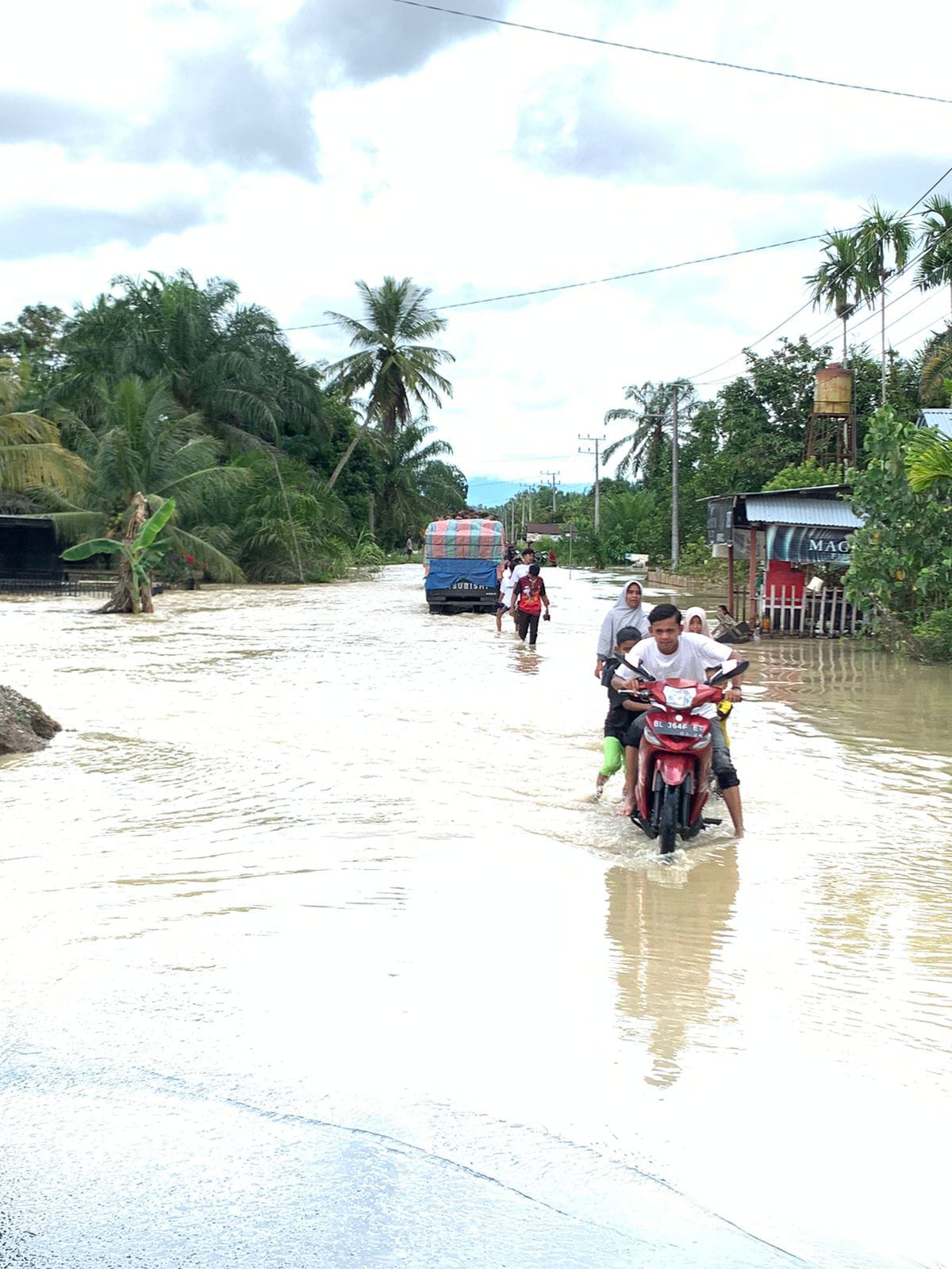 Pantauan media ini dilapangan bahwa banjir telah mengenai ratusan rumah dengan ketinggian air di rumah 1 meter sedangkan di atas jalan setinggi 60 cm,