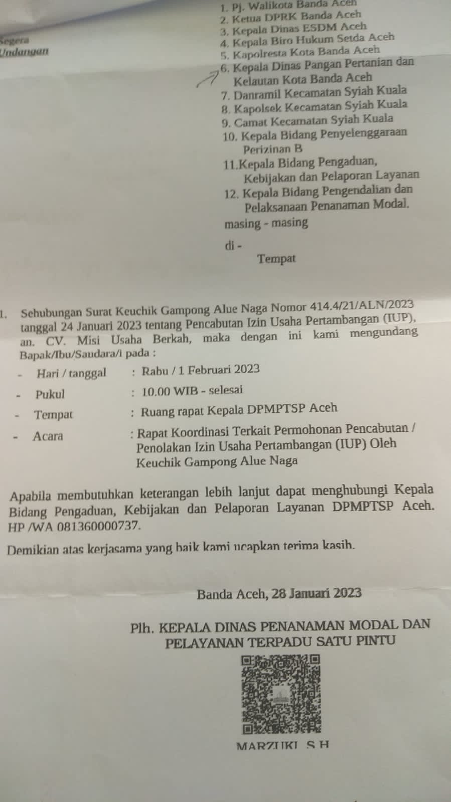 Hal tersebut sebagaimana Surat Keuchik Gampong Alue Naga, nomor 414.4/21/ALN/2023 tanggal 24 Januari 2023 tentang Pencabutan Izin Usaha Pertambangan (IUP), an CV Misi Usaha Berkah, yang dikirimkan ke DPMPTSP Aceh.