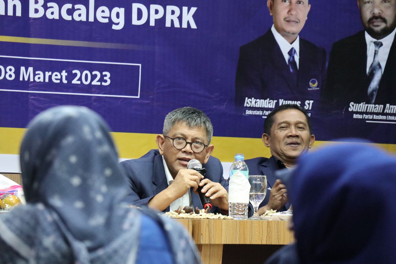 Ketua DPW NasDem Aceh Taufiqulhadi, menyampaikan perihal hal yang harus dilakukan untuk memperoleh peningkatan kursi legislatif dari pada Partai NasDem.