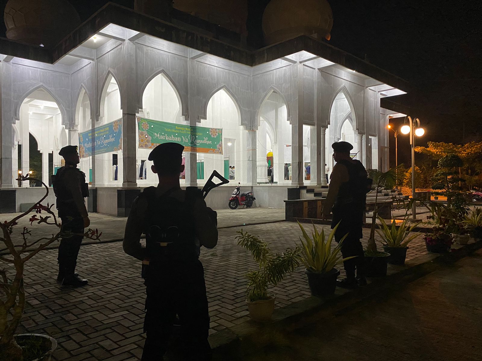APJN.NET |LHOKSEUMAWE – Tim Unit Reaksi Cepat (URC) Sat Samapta Polres Lhokseumawe siaga di masjid guna melakukan pengamanan shalat Isya dan tarawih, Rabu (5/4/2023) malam.
