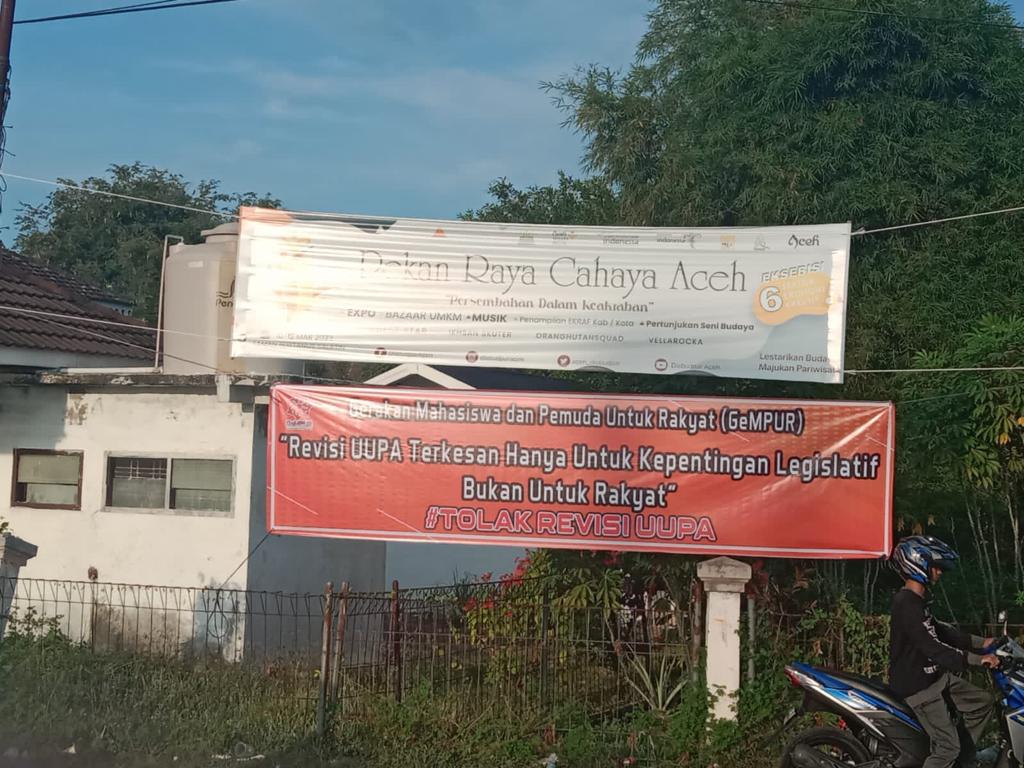 Sementara itu dalam spanduk berlatar orange yang dipasang di kawasan lintas Darussalam Gerakan Mahasiswa dan Pemuda Untuk Rakyat (GeMPUR) bertuliskan “Revisi UUPA Terkesan Hanya untuk Legislatif Bukan Untuk Rakyat, #Tolak Revisi UUPA”.
