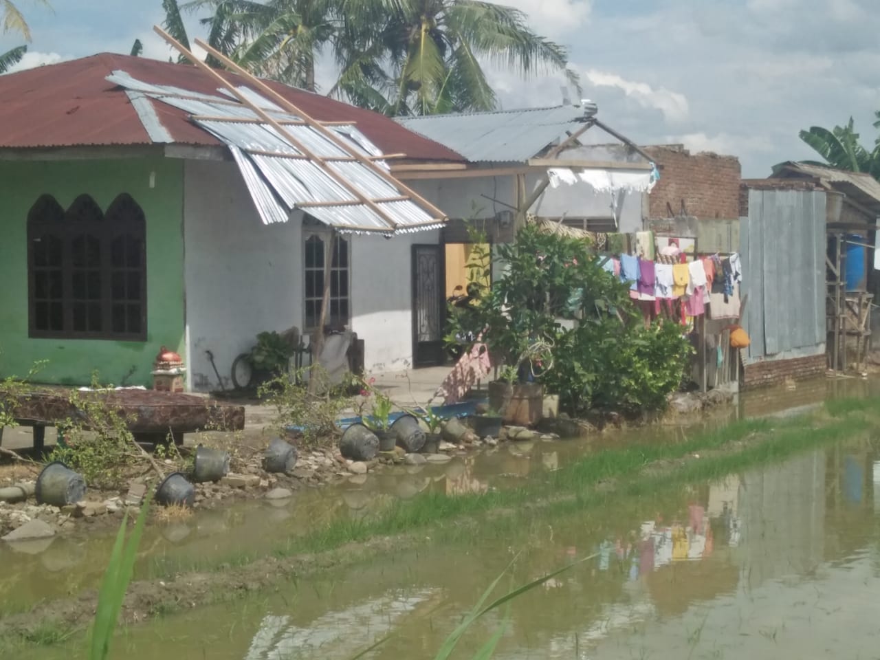 Salah satu rumah warga di dusun Madiun B Desa Sidodadi Ramunia Kecamatan Beringjn, Deli Serdang atap rumah (seng) terbang kerumah tetangganya saat terjadi hujan disertai badai. Kerugian diperkirakan mencapai Rp30jt an.