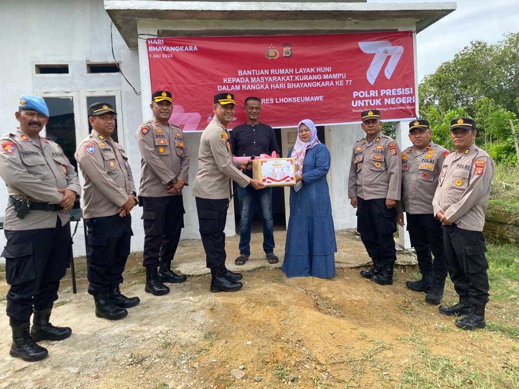 APJN.net, LHOKSEUMAWE | Dalam rangka Hari Bhayangkara ke 77, Kapolres Lhokseumawe, AKBP Henki Ismanto SIK menyerahkan rumah layak huni kepada warga Meunasah Alue, Kecamatan Muara Dua, Kota Lhokseumawe, Jumat (30/6/2023).
