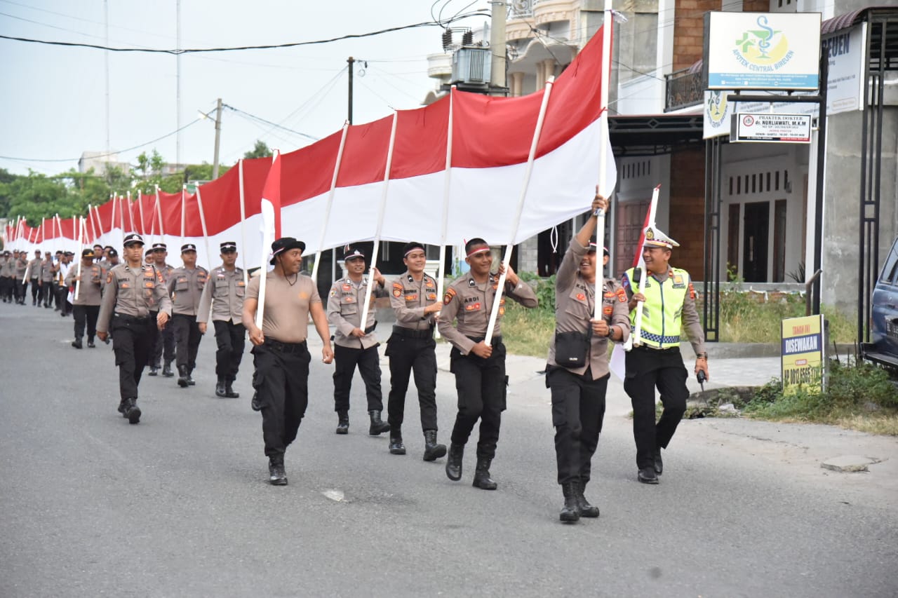 APJN.net|BIREUEN – Semangat Perjuangan, Polres Bireuen dan Jajaran Kirab Bendera Merah Putih sepanjang 100 M