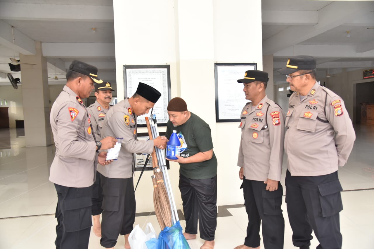 APJN.net|BIREUEN|Polres Bireuen, menyerahkan alat kebersihan di Mesjid Taqwa Muhammadiyah Desa Geulanggang Baroe, Kecamatan Kota Juang Kabupaten Bireuen, Jumat (04/08/2023).