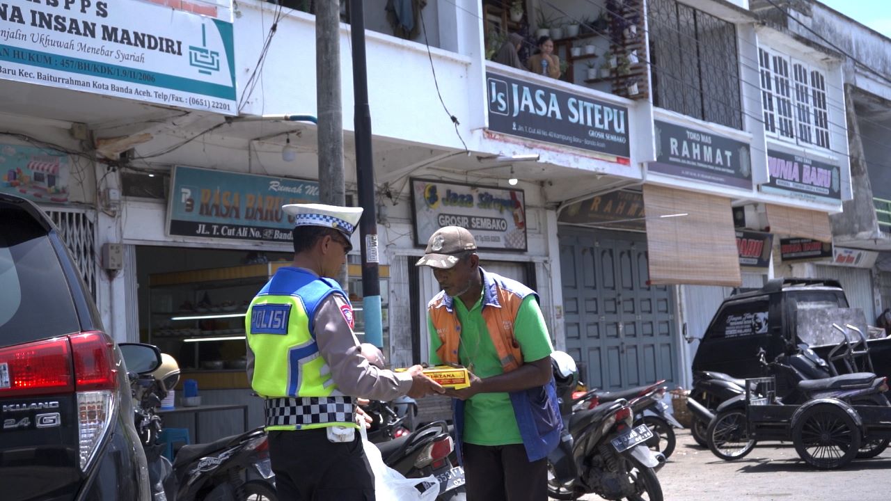 APJN.net|BANDA ACEH| Personel Subdit Kamsel Ditlantas Polda Aceh, membagikan nasi kotak kepada tukang parkir, pengemis, dan tunawisma di Pasar Aceh, Kota Banda Aceh, Jumat (4/8/ 2023).
