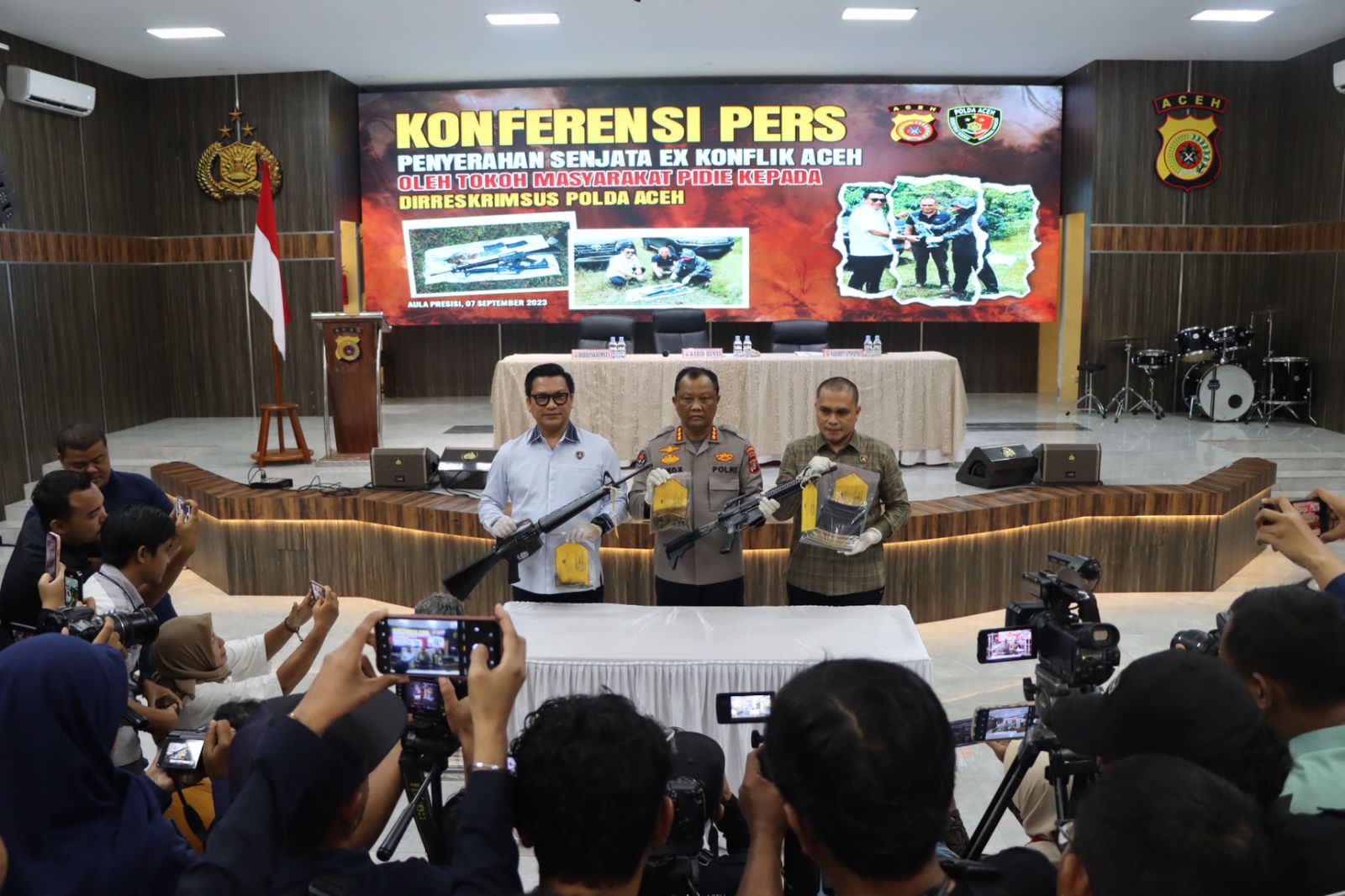 APJN.net|BANDA ACEH — Dua pucuk senjata api (senpi) laras panjang jenis M-16 sisa konflik Aceh yang diterima Dirreskrimsus Polda Aceh Kombes Winardy dari tokoh masyarakat di Kabupaten Pidie dalam kondisi masih aktif.