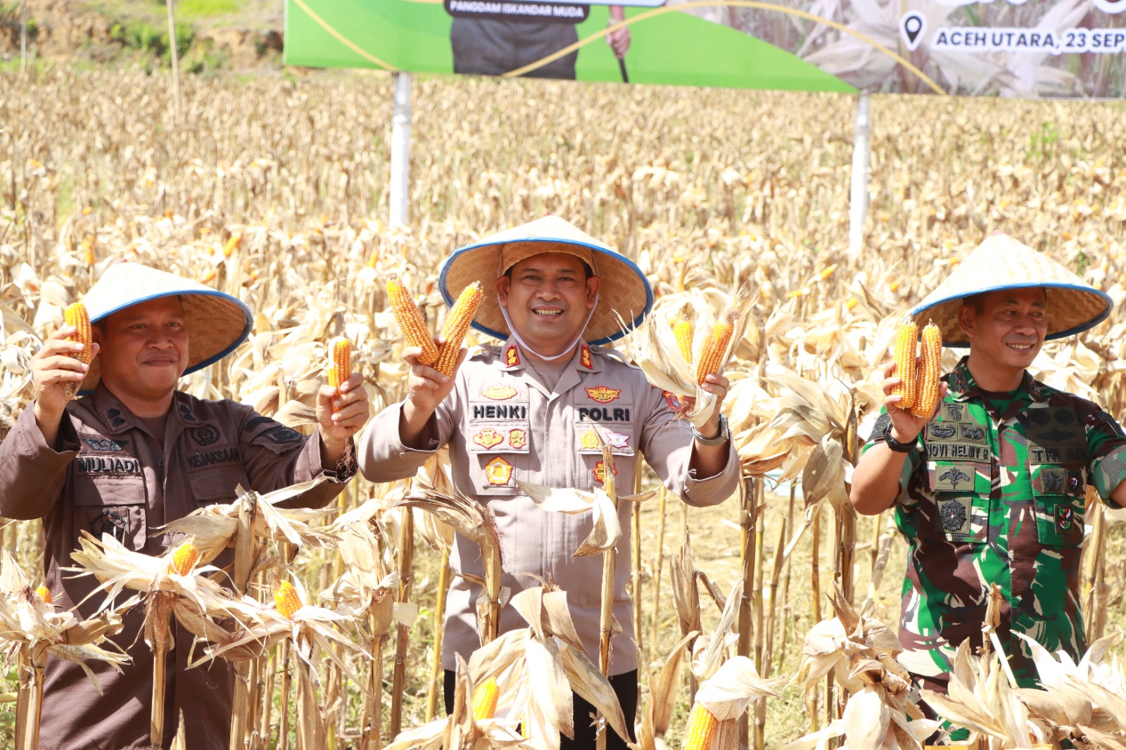 APJN.NET|LHOKSEUMAWE – Wakili Kapolda Aceh, Kapolres Lhokseumawe, AKBP Henki Ismanto bersama Pangdam Iskandar Muda, Mayjen Novi Helmi Prasetya panen jagung perdana di Desa Ulee Geudong, Kecamatan Sawang, Aceh Utara, Sabtu (23/9/2023).
