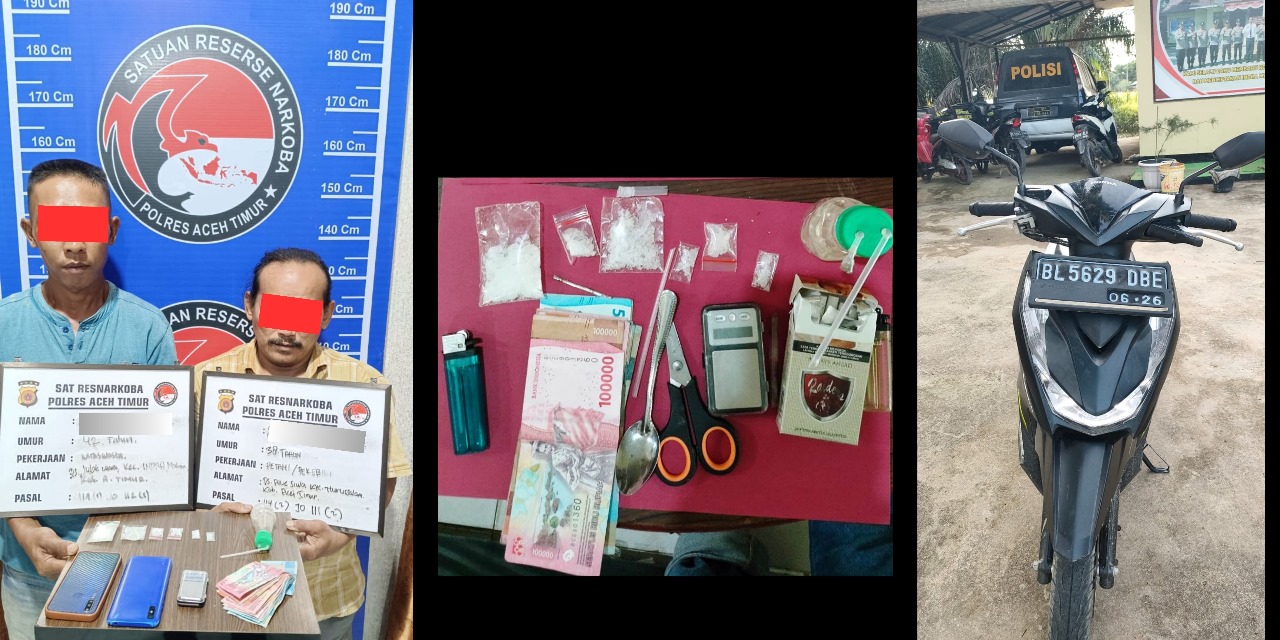 Kapolres Aceh Timur AKBP Nova Suryandaru SIK, melalui Kasat Narkoba Iptu Yudha Perkasa SH, menyebutkan dua tersangka tersebut berinisial SA, 41 tahun warga Desa Julok Rayeuk Utara, Kecamatan Indra Makmu dan SU, 37 tahun, warga Desa Alue Siwah Kecamatan Nurussalam, Kebupaten Aceh Timur.