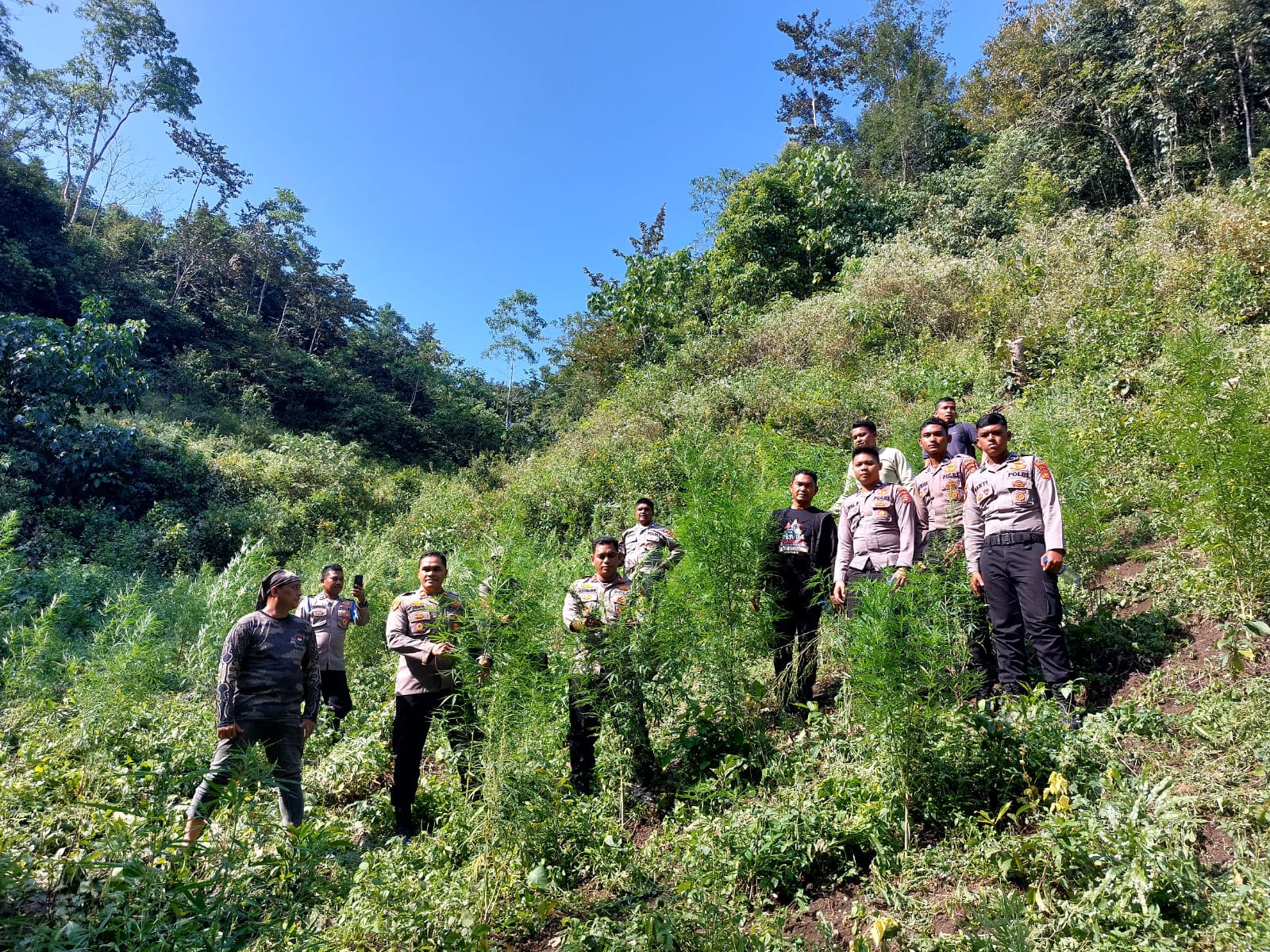 Adapun Luas ladang ganja keseluruhan lebih kurang 1 Hektar dengan jumlah tanaman sebanyak 600 batang dengan umur 1 s/d 2 bulan.Pemusnahan dilakukan dengan cara mengumpulkan batang ganja tersebut yang kemudian dimusnahkan dengan cara dibakar.