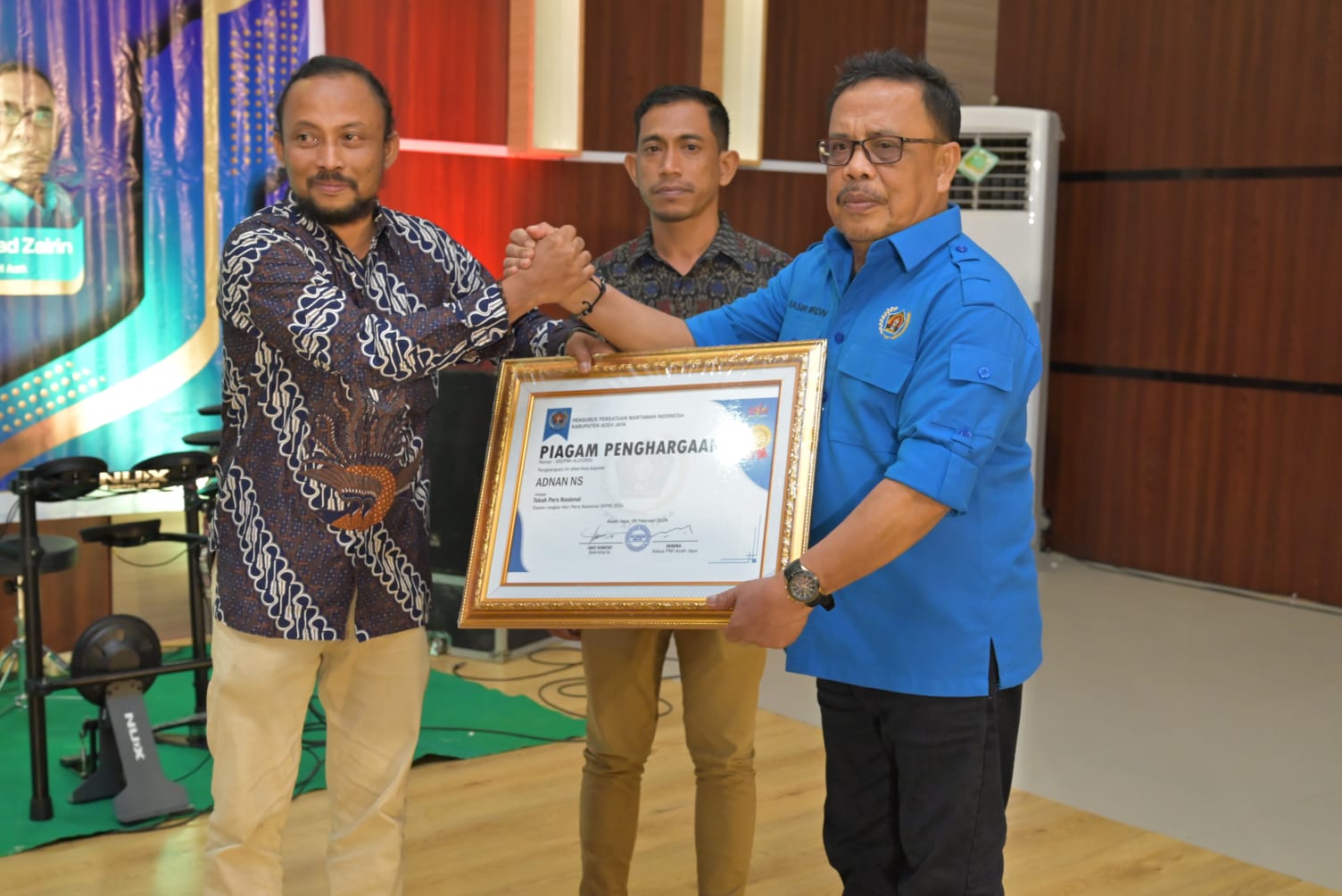 Untuk terselenggaranya hajatan ini, Ketua PWI Aceh M Nasir Nurdin menyerahkan penghargaan ini kepada putranya Muhtadi Khadafi, kebetulan wartawan juga.