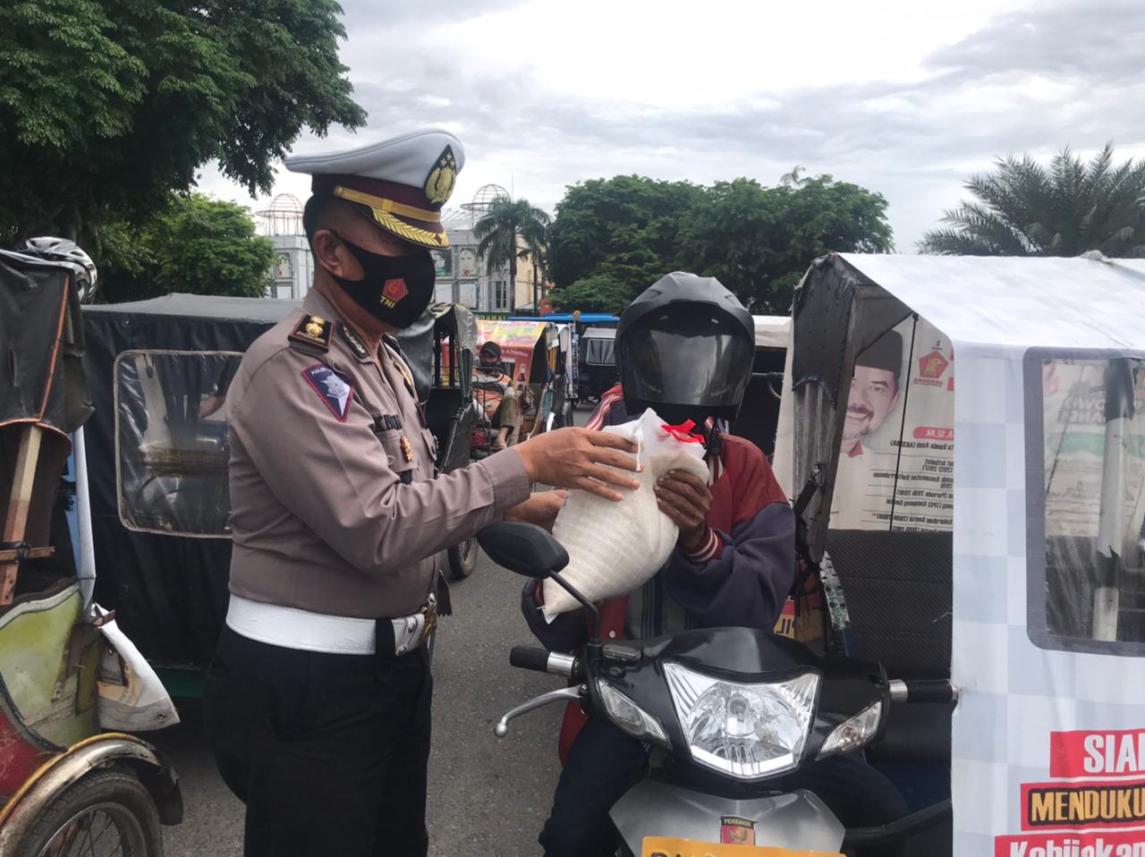 Personel Ditlantas saat membagikan beras kepada 100 tukang becak sembari mengingatkan bila beraktivitas tetap menerapkan prokes dan selalu pakai masker untuk mencegah dan memutus mata rantai penyebaran Covid-19 di Provinsi Aceh, pungkas Dirlantas. []