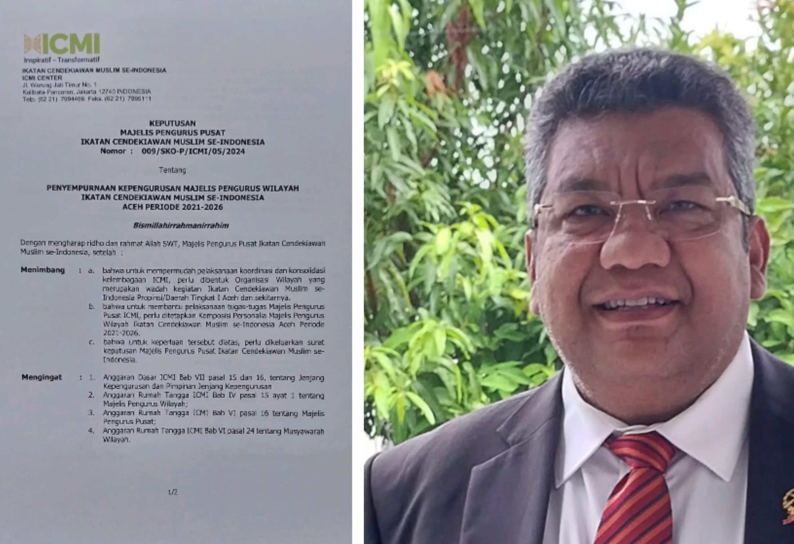 APJN.NET| BANDA ACEH, Ketua MPW ICMI Aceh, Dr Taqwaddin, membenarkan bahwa dirinya telah menerima SK baru, tentang Penyempurnaan Pengurus ICMI Aceh yang di tandatangani oleh Ketua Umum dan Sekretaris Jenderal Majelis Pengurus Pusat (MPP) Ikatan Cendekiawan Muslim se-Indonesia (ICMI) yaitu Prof Arif Satria dan Dr Andi Yuliani Paris, MSc, pada tanggal 8 Mei 2024.