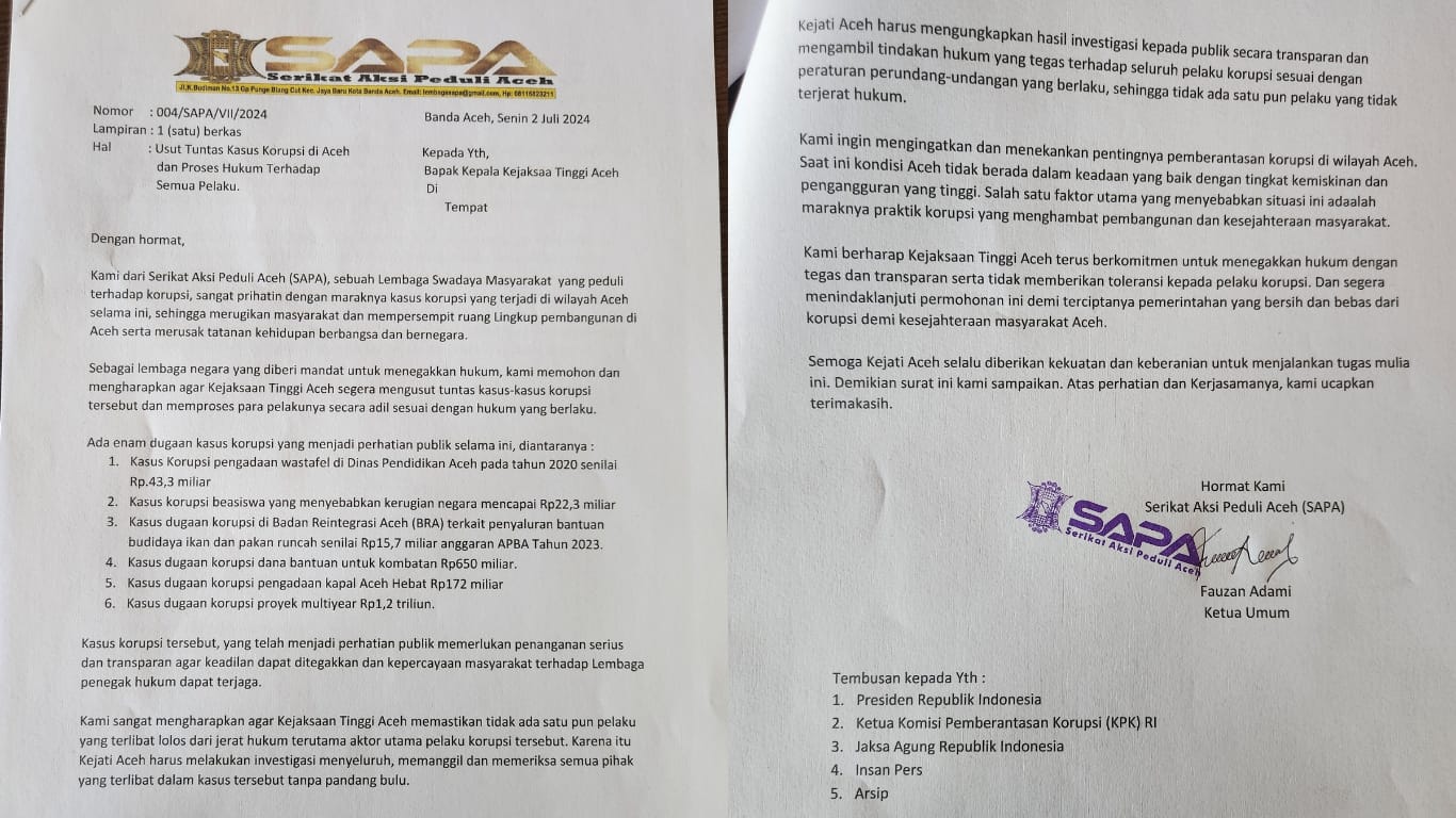 “Kami sangat mengharapkan agar Kejaksaan Tinggi Aceh memastikan tidak ada satu pun pelaku yang terlibat lolos dari jerat hukum terutama aktor utama pelaku korupsi tersebut,” ujarnya, dalam isi surat tersebut.
