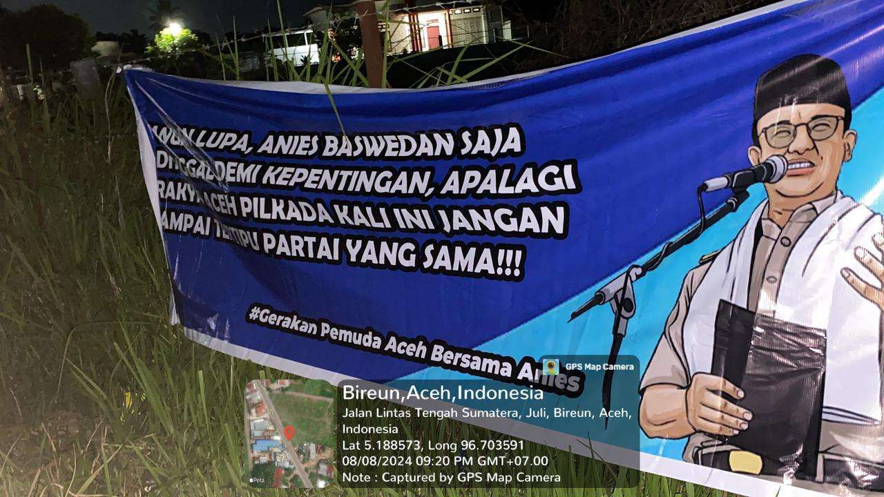 Di Simpang Mesra kecamatan Syiah Kuala Kota Banda Aceh, terlihat adanya spanduk berisikan tulisan “Kami orang Aceh sudah sadar, Anies saja dikhianati apalagi rakyat. Rakyat Aceh tidak akan terjatuh ke lobang yang sama pada Pilkada 2024 nanti”. Spanduk itu berasal dari Rakyat Aceh bersama Anies.