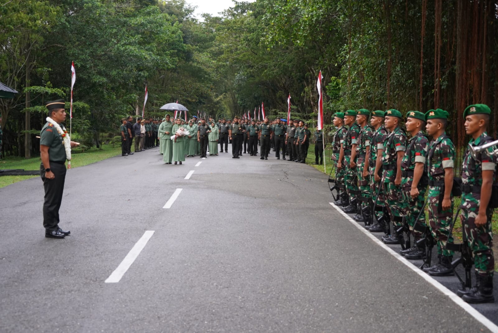 Ia kemudian menerima hormat jajar dari Regu Jaga, serta melalui prosesi tradisi pedang pora yang menambah suasana khidmat saat Komandan beserta istri berjalan di antara para perwira pedang pora.