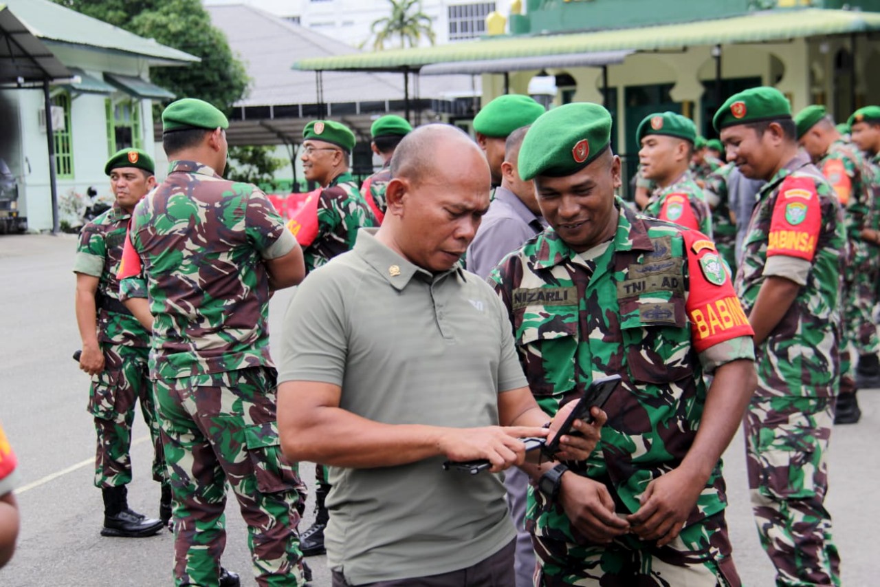 Ratusan personel TNI dari Kodim 0101/Kota Banda Aceh berkumpul di Lapangan Makodim, Jalan STA Mahmudsyah, Nomor 32, Gampong Baro, Kecamatan Baiturrahman, untuk mengikuti pemeriksaan HP dalam rangka mencegah personel terjerat pengaruh negatif perjudian online, Rabu (6/11/2024).