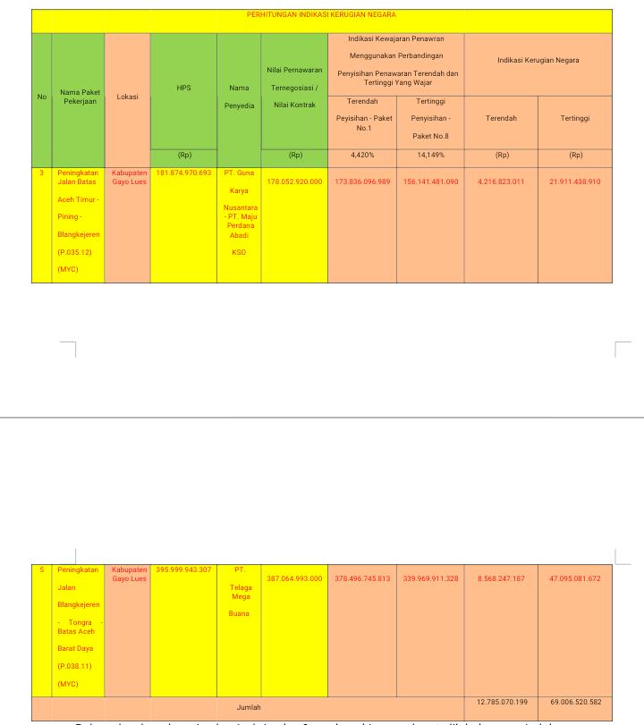 Sementara itu, untuk Paket Pekerjaaan Peningkatan Jalan Batas Aceh Timur – Pining – Blangkejeren (P.035.12) (MYC) dengan Kode Tender 29457106 pada LPSE Provinsi Aceh diperkirakan adanya indikasi potensi kerugian negara paling rendah sebesar Rp. 8.568.247.187 atau paling tinggi bisa jadi mencapai Rp. 47.095.081.672 ,-.