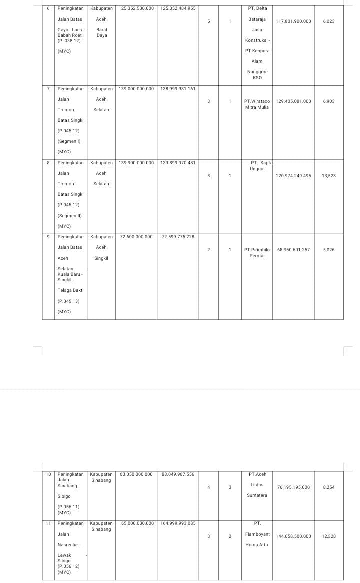 Pembangunan jalan Tongra – Batas Aceh Barat Daya (P.038.11) (MYC) dengan Kode Tender 29456106 dan Paket Pekerjaaan Peningkatan Jalan Batas Aceh Timur – Pining – Blangkejeren (P.035.12) (MYC) dengan Kode Tender 29457106 pada LPSE Provinsi Aceh.