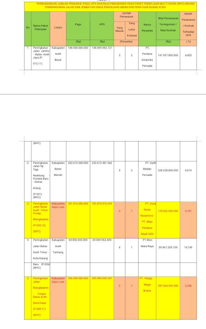 6) Perbandingan antara jumlah Penawar, Pagu, HPS Dan Nilai Penawaran pada paket pekerjaan tahun jamak (multi years) disinyalir bahwa Anomali penyisihan penawaran =< 2,5% hanya terjadi pada Paket Pekerjaan Peningkatan Jalan Blangkejeren – Tongra – Batas Aceh Barat Daya (P.038.11) (MYC) dengan Kode Tender 29456106 dan Paket Pekerjaaan Peningkatan Jalan Batas Aceh Timur – Pining – Blangkejeren (P.035.12) (MYC) dengan Kode Tender 29457106.