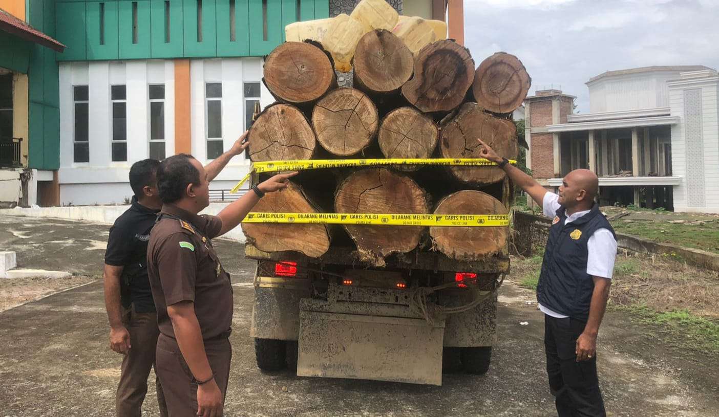 Selain kedua tersangka, penyidik juga menyerahkan barang bukti berupa satu unit mobil dump truck dan sebelas batang kayu bulat jenis rimba campuran.