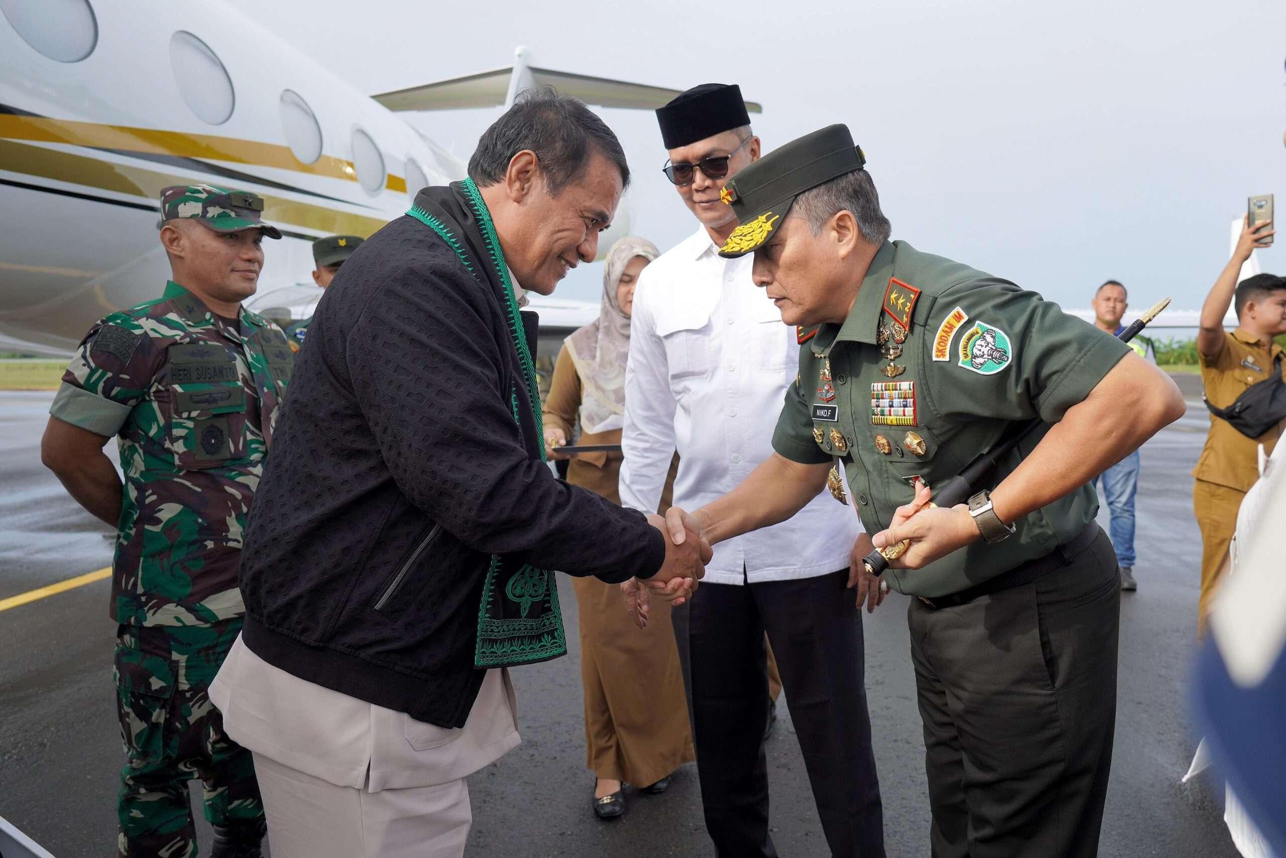 APJN.NET, ACEH UTARA – Panglima Komando Daerah Militer Iskandar Muda (Pangdam IM), Mayor Jenderal TNI Niko Fahrizal, M.Tr.(Han), menyambut kedatangan Menteri Pertanian Republik Indonesia, Dr Ir H. Andi Amran Sulaiman MP, beserta rombongan di Bandara Malikussaleh, Desa Pintu Makmur, Kecamatan Muara Batu, Kabupaten Aceh Utara, Selasa (10/12/2024).