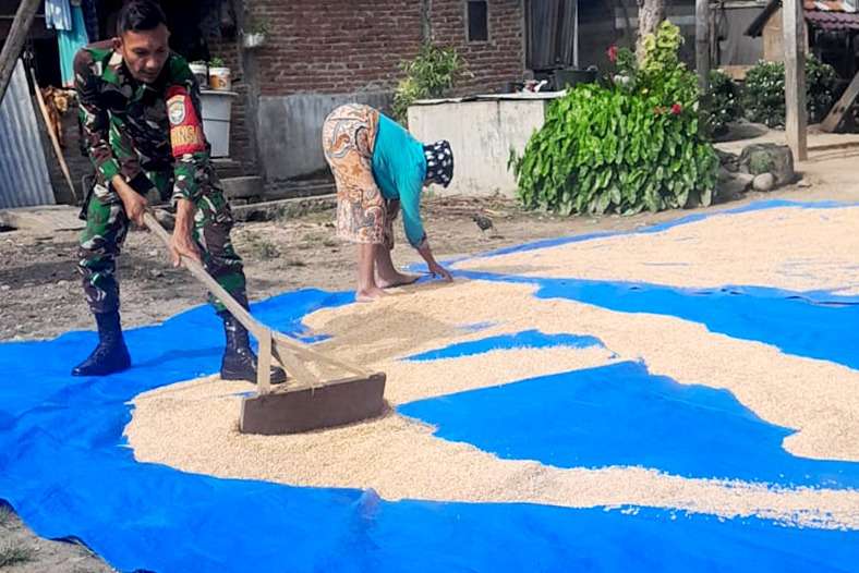 Menjemur gabah bukan pekerjaan ringan. Butuh waktu berjam-jam di bawah sinar matahari agar kadar air dalam gabah berkurang, sehingga hasil panen tidak cepat rusak. Kesadaran akan pentingnya peran petani dalam ketahanan pangan membuat Serda M. Iskandar yang merupakan anggota Koramil 01/Seulimeum, Kodim 0101/Kota Banda Aceh, tergerak untuk membantu.