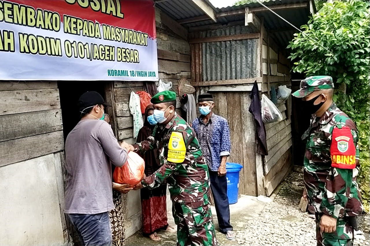 APJN.net – Aceh Besar | Personil Komando Rayon Militer (Koramil) 18/Ingin Jaya memberikan bantuan berupa Sembilan Bahan Pokok (Sembako) yang diperuntukkan bagi masyarakat kurang mampu terdampak Pandemi Covid 19 di wilayah binaan, Rabu (7/7/2021).