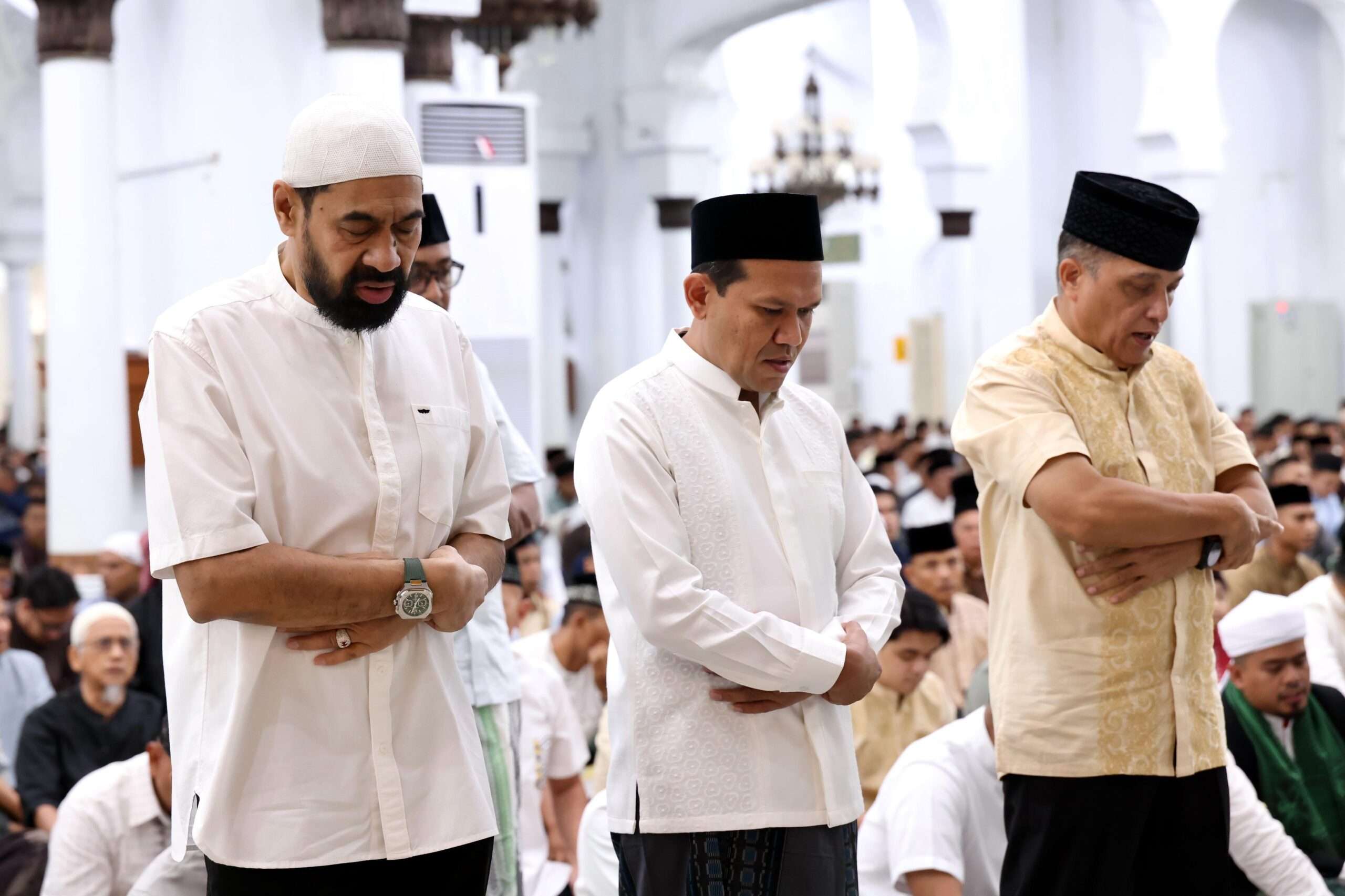 BANDA ACEH, Gubernur Aceh, H. Muzakir Manaf, bersama Wakil Gubernur Aceh, Fadhlullah, melaksanakan salat Idul Fitri 1446 Hijriah di Masjid Raya Baiturrahman, Banda Aceh, pada Senin, 31 Maret 2025.