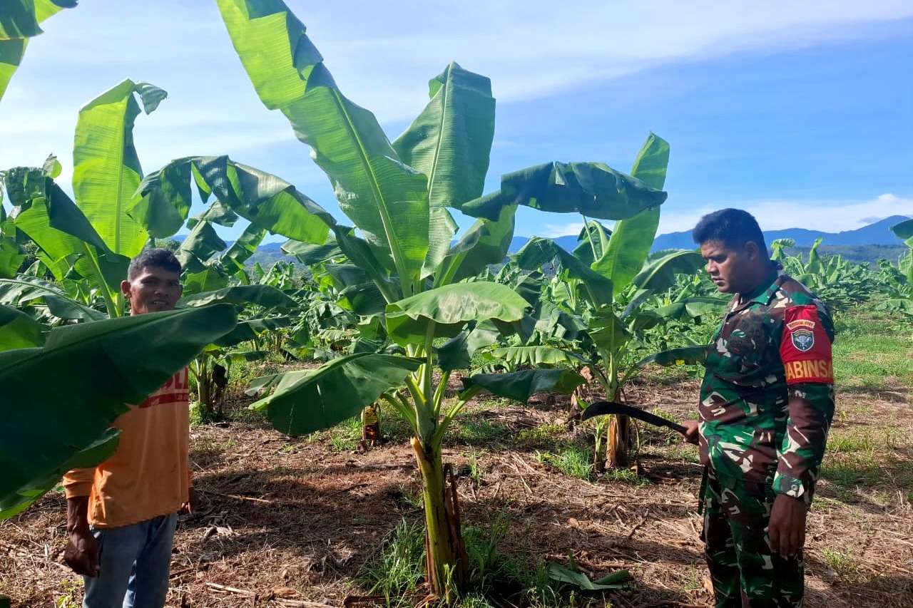 Sertu Ikhwanudin terlihat dengan penuh semangat mengunjungi kebun pisang milik Jalaludin, salah seorang petani setempat. Kedatangan Babinsa ini bukan hanya untuk sekadar melihat kondisi kebun, melainkan juga untuk memberikan pendampingan secara langsung dalam perawatan tanaman pisang.