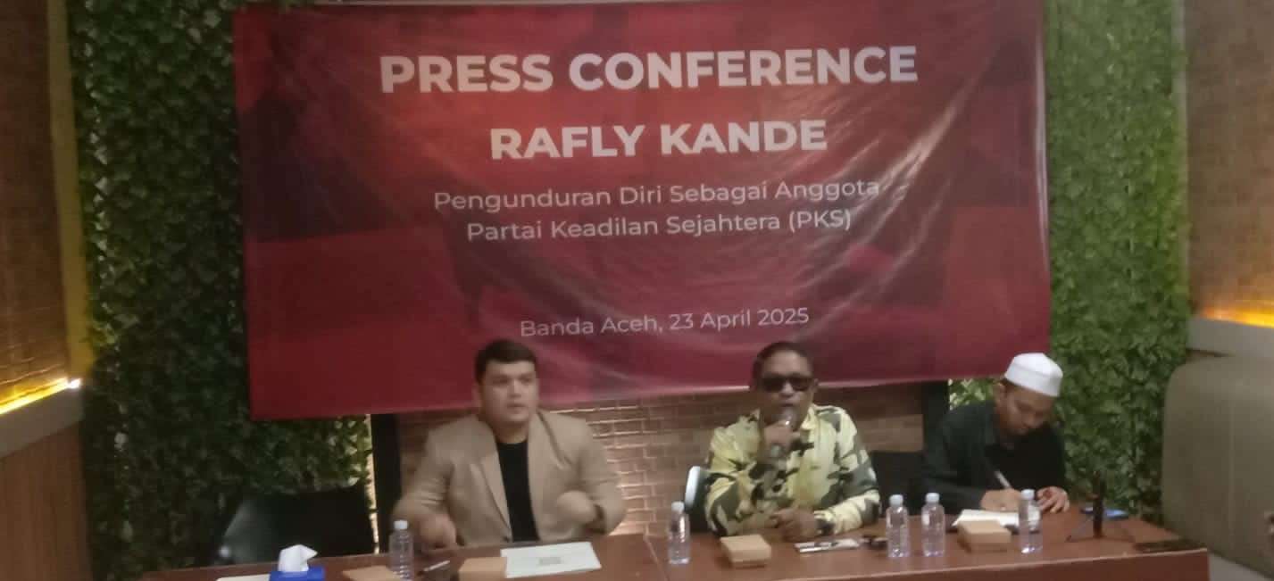 BANDA ACEH, Rafly Kande selaku Anggota DPD RI periode 2014-2019 dan juga Anggota DPR RI Dapil Aceh 1 dari Fraksi Partai Keadilan Sejahtera Periode 2015-2024, menyampaikan terkait dengan pernyataan pengunduran dirinya, sebagai keanggotaan Partai Keadilan Sejahtera, Rabu (23/4/2025) di Kota Banda Aceh.