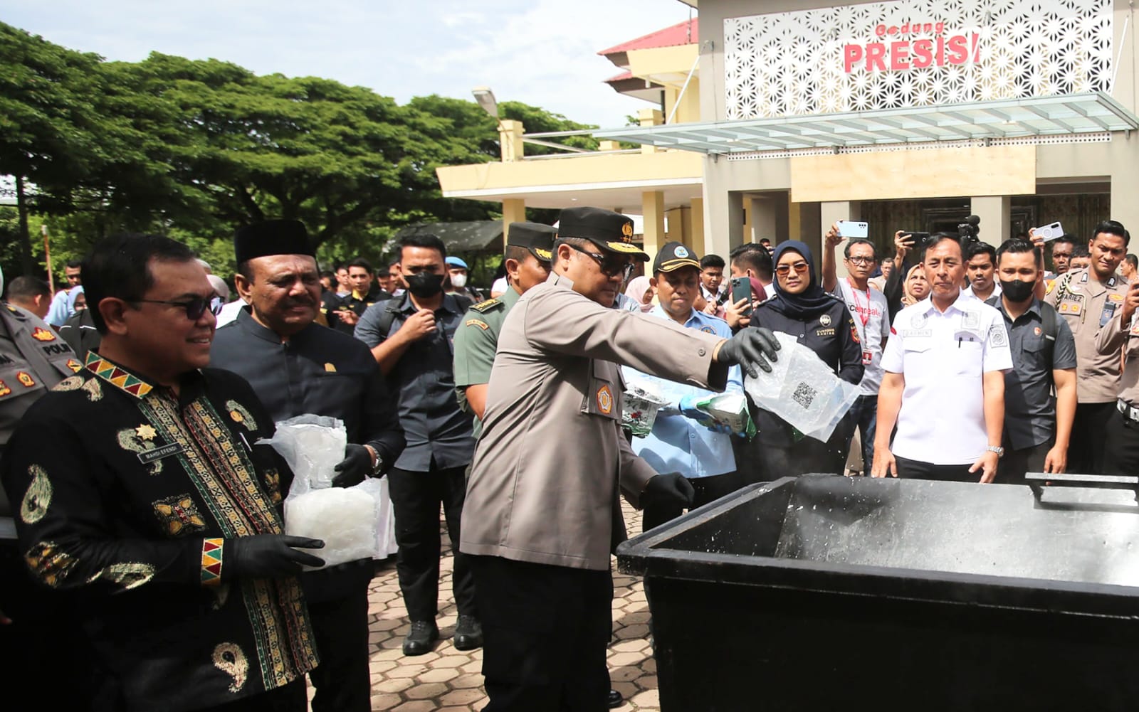 BANDA ACEH — Kapolda Aceh Irjen Dr. Achmad Kartiko memimpin kegiatan pemusnahan barang bukti narkotika hasil pengungkapan Direktorat Reserse Narkoba (Ditresnarkoba) Polda Aceh, bekerja sama dengan Direktorat Intelkam, Kantor Wilayah Bea Cukai, Polresta Banda Aceh, Polres Langsa, dan Polres Gayo Lues. Barang bukti yang dimusnahkan terdiri atas 25 kilogram kokain, 108 kilogram sabu, dan 640 kilogram ganja.