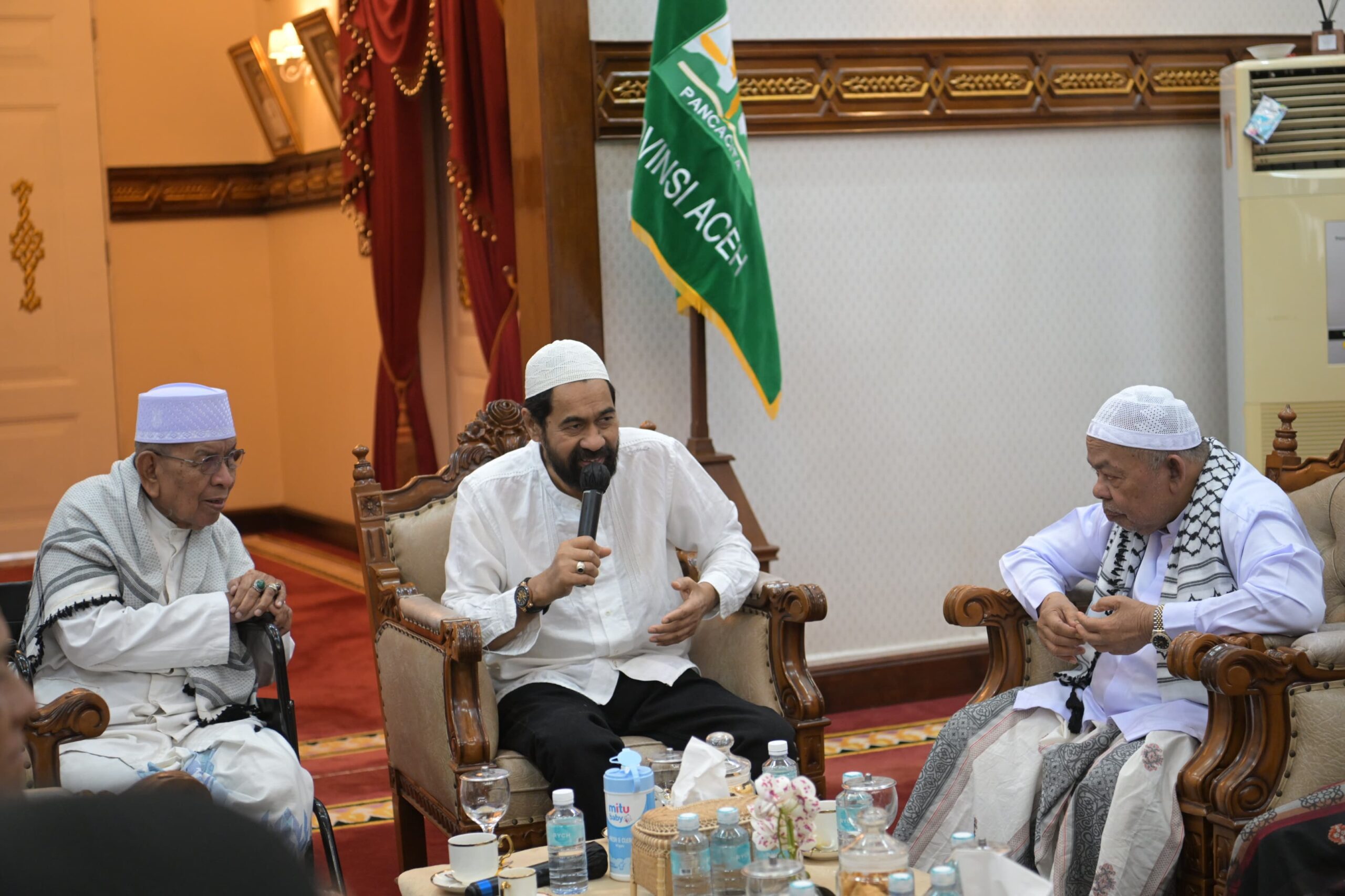 BANDA ACEH – Gubernur Aceh, Muzakir Manaf atau Mualem, menerima kunjungan silaturahmi para ulama Majelis Ulama Nanggroe Aceh (MUNA) di Meuligoe Gubernur, Sabtu (23/8/2025).