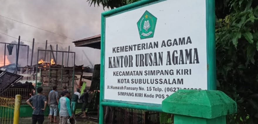 APJN.NET -KOTA SUBULUSSALAM | Kantor Urusan Agama (KUA) Kecamatan Simpang Kiri, Kota Subulussalam, hangus terbakar dilalap si jago merah bersama sejumlah ruko dan rumah di Jalan Syekh Hamzah Fansuri, Desa Subulussalam Selatan, Sabtu (31/7/2021).