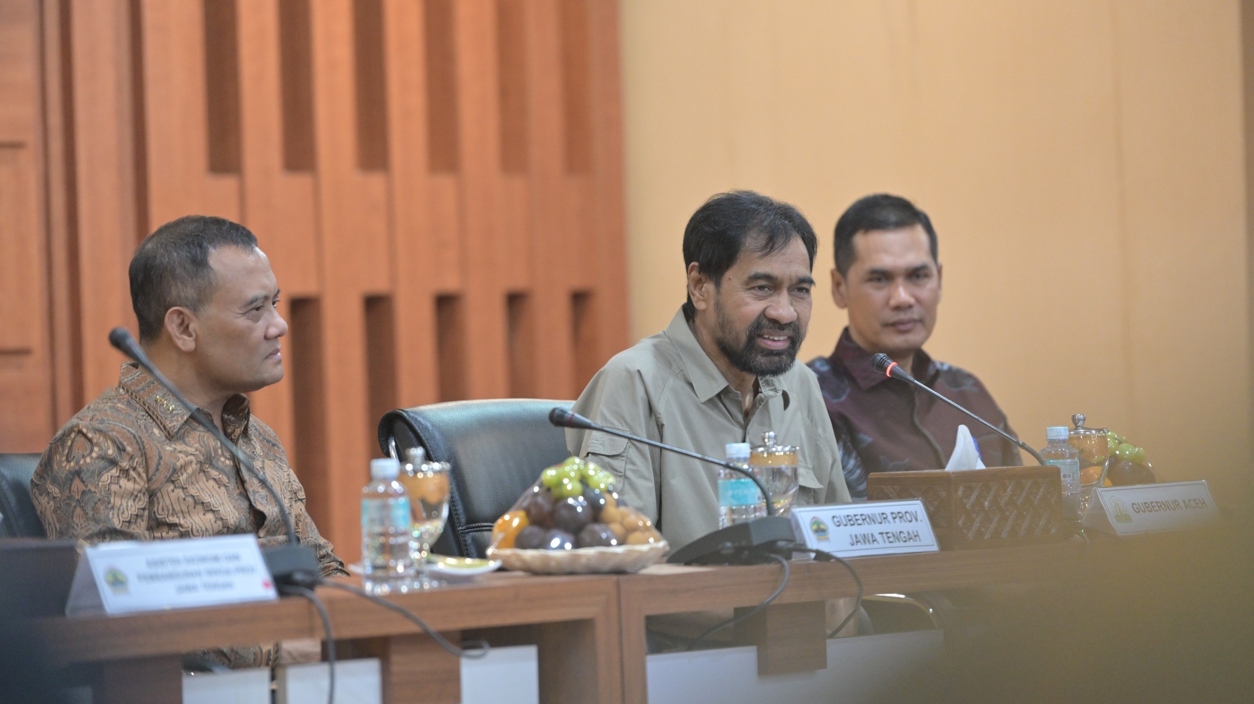 BANDA ACEH – Gubernur Aceh, H. Muzakir Manaf (Mualem), didampingi Sekretaris Daerah Aceh, M. Nasir, S.IP., MPA, serta Asisten Pemerintahan, Keistimewaan Aceh, dan Kesejahteraan Rakyat (Asisten I), Drs. Syakir, M.Si, menerima kunjungan kerja Gubernur Jawa Tengah, Komjen Pol. (Purn) Drs. Ahmad Luthfi, S.H., S.St.M.K., beserta jajaran Pemerintah Provinsi Jawa Tengah di Gedung Serbaguna Sekretariat Daerah Aceh, Kamis (23/4).