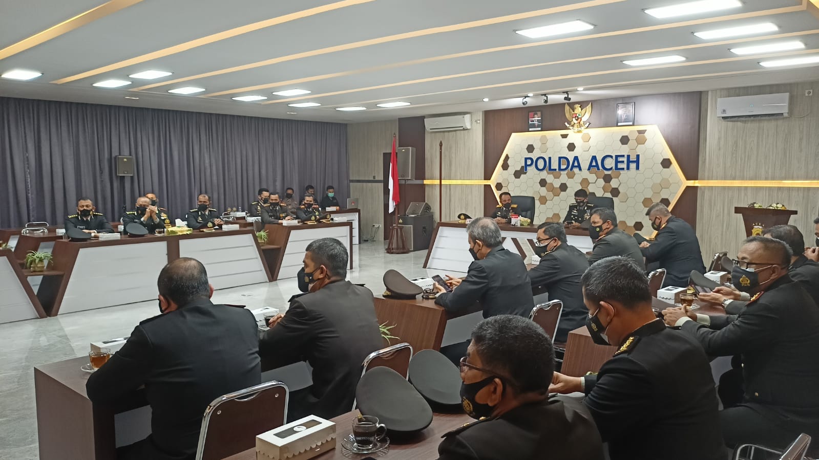 Di Aula Machdum Sakti Mapolda Aceh, para Pejabat Polda Aceh mengikuti upacara detik-detik Proklamasi kemerdekaan RI itu dengan menerapkan prokes yang ketat, pungkas Kabid Humas[]