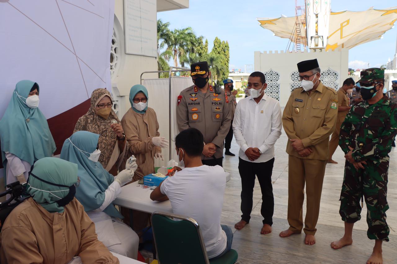 APJN.NET – BANDA ACEH – Sejumlah Pejabat Forkopimda Aceh terdiri dari Gubernur Aceh Ir. Nova Iriansyah, M. T, Kapolda Aceh Irjen Pol. Drs. Ahmad Haydar, S. H. M. M, dan Pangdam IM Mayjen TNI Ahmad Marzuki meninjau berlangsungnya pelaksanaan vaksinasi merdeka yang digelar di halaman Masjid Raya Baiturrahman, Banda Aceh, Selasa (7/9/21).