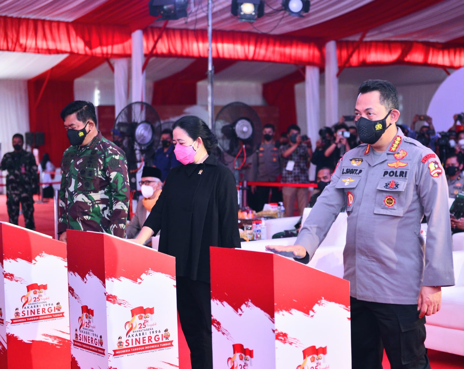 APJN.NET- JAKARTA – Ketua DPR RI Puan Maharani, Panglima TNI Marsekal Hadi Tjahjanto, dan Kapolri Jenderal Listyo Sigit Prabowo, meninjau langsung pelaksanaan vaksinasi massal, penyerahan bansos dan launching transformasi digital UMKM Presisi yang diselenggarakan oleh Alumni Akabri 1996 atau Bharatasena di SMKN 2 Tangerang, Banten, Kamis (23/9/2021).