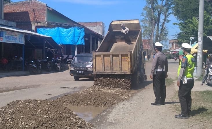 APJN.NET – ACEH BESAR- Jalan berlubang merupakan salah faktor terjadinya kecelakaan. Untuk menghindari hal tersebut, Personel Satlantas Polres Aceh Besar berinisiatif menimbun lubang di sepanjang jalan Montasik-Blang Bintang, Desa Seuneulhop, Aceh Besar, Selasa (5/10/2021).