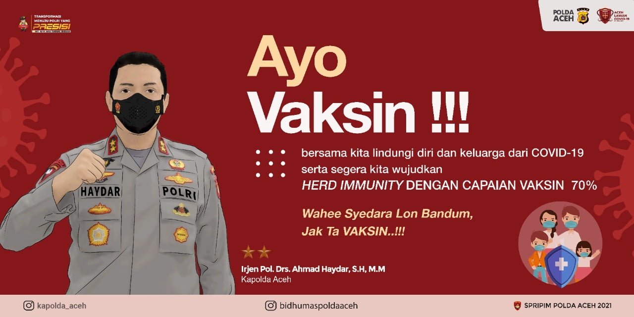 APJN.NET – BANDA ACEH – Kapolda Aceh Kapolda Aceh Irjen Pol. Drs. Ahmad Haydar, S.H., M.M. melalui Kabid Humas Kombes Pol. Winardy, S.H., S.I.K., M.Si. meminta seluruh masyarakat di wilayah hukumnya yang memenuhi persyaratan agar melaksanakan vaksinasi baik dosis I maupun dosis II agar target capaian 70 persen pada akhir Desember ini bisa terpenuhi.
