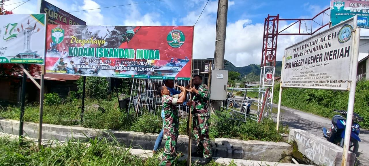 Di tempat terpisah Dandim, Letkol Inf Eko Wahyu Sugiarto saat di konfirmasi melalui saluran telepon menyampaikan, spanduk bertuliskan Dirgahayu Kodam Iskandar Muda 22 Desember 1956 – 22 Desember 2021, bertajuk “TNI Bersama Rakyat Menuju Aceh Damai dan Sejahtera”
