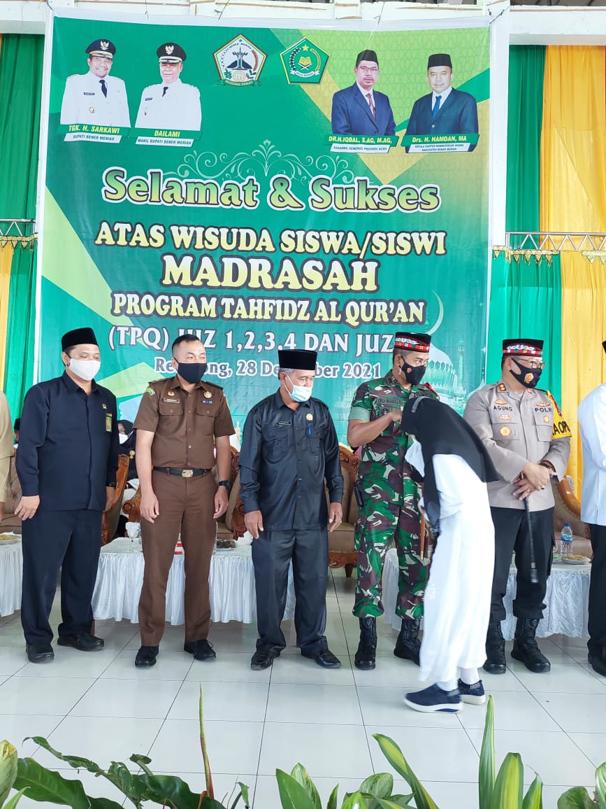 Dandim 0119/BM Letkol Inf Eko Wahyu Sugiarto, Kapolres Bener Meriah AKBP Agung Surya Prabowo, S.I.K , Kajari Bener Meriah yang di wakili Kasi Pidsus, Kejari Bener Meriah.Aulia SH, Kakankemenag Bener Meriah Drs H.Hamdan, MA, Asisten I Drs. Muklis, Kadis Syariat Islam Taslim S.Ag, dan Peserta wali murid Hafidz fan Hafizah.