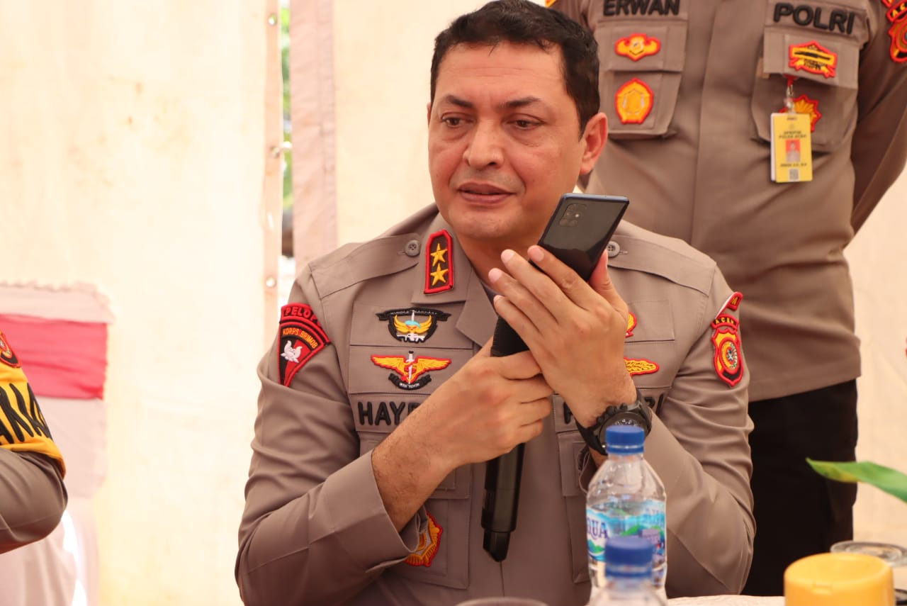 APJN.NET – ACEHBESAR – Kapolda Aceh Irjen Pol. Drs. Ahmad Haydar, S. H., M. M. yang didampingi Wakapolda Brigjen Pol. Dr. Drs. H. Agus Kurniady Sutisna, MM., MH. serta Irdam IM Brigjen TNI Niko Fahrizal, M. Tr. (Han). mengundi langsung peserta vaksinasi yang mendapatkan hadiah paket umrah gratis, Selasa (28/12/2021) saat peninjauan vaksinasi di Halaman Meunasah Desa Tungkop, Darussalam, Aceh Besar.
