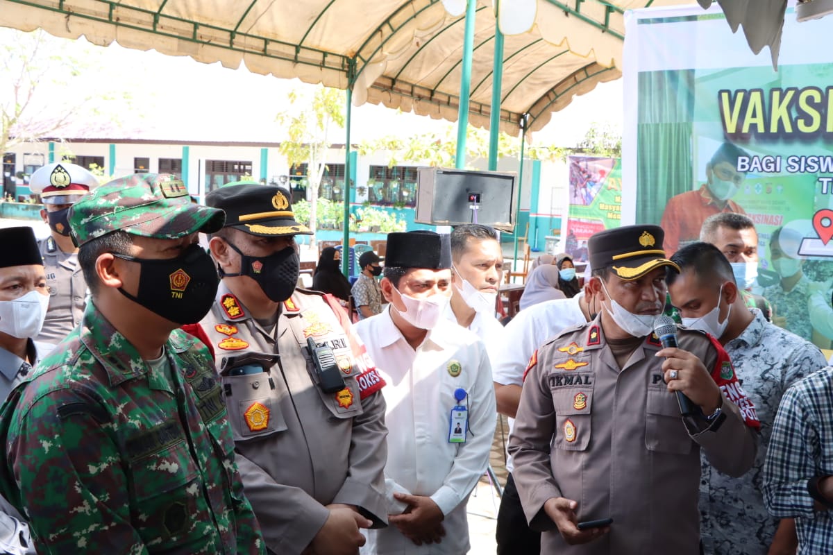 APJN.NET – ACEH BARAT – Kepala Kepolisian Resor (Kapolres) Aceh Barat AKBP Andrianto Argamuda, S.I.K. didampingi Dandim 0105/Abar Letkol Inf Dimar Bahtera, S.Sos., M.A.P. mengundi peserta vaksinasi yang mendapatkan paket umrah gratis, Selasa (28/12/2021) di Sekolah MIN 8 Meulaboh.