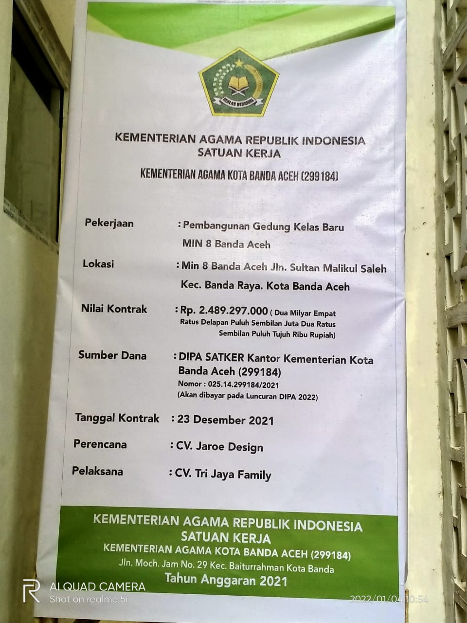 APJN.NET – BANDA ACEH – Pelaksanaan Pembangunan gedung kelas baru Sekolah MIN 8 Kota Banda Aceh masih terus dikerjakan pembangunannya oleh Rekanan CV Tri Jaya Family sebagaimana tercantum dalam plang kegiatan dengan besaran anggaran Rp2.263.907.085,31, melalui Sumber Dana, DIPA Satker Kantor Kementerian Kota Banda Aceh (299184), Nomor 025.04.299184/2021 Tanggal 23 November 2020.