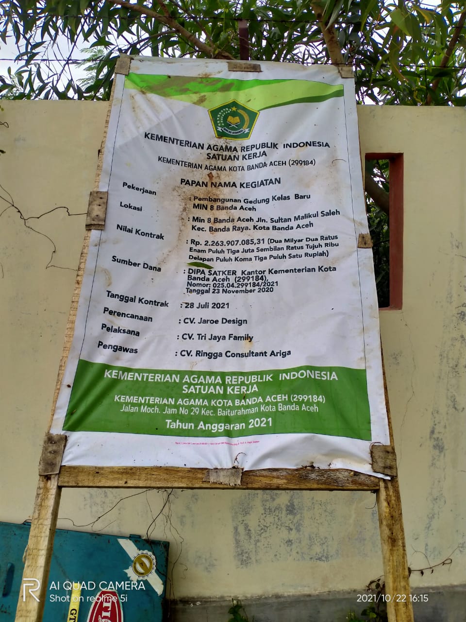 Tanggal Kontrak 28 Juli 2021 dengan Perencanaan CV Jaroe Design, Pelaksana CV Tri Jaya Family dan Pengawas CV Ringga Consultant Ariga.
