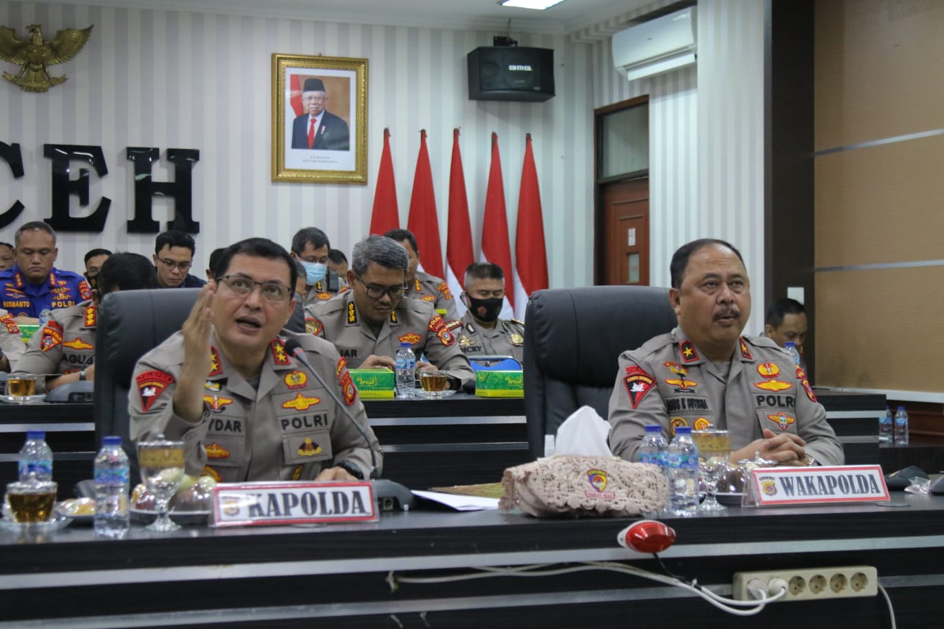 APJN.NET-BANDAACEH-Kapolda Aceh Irjen Pol. Drs. Ahmad Haydar, S. H., M. M. yang didampingi Wakapolda Aceh Brigjen Pol. Dr. Drs. H. Agus Kurniady Sutisna, MM., MH. memberikan arahan kepada seluruh jajaran terkait kegiatan vaksinasi merdeka anak, Kamis (6/1/2021) di Mapolda Aceh.