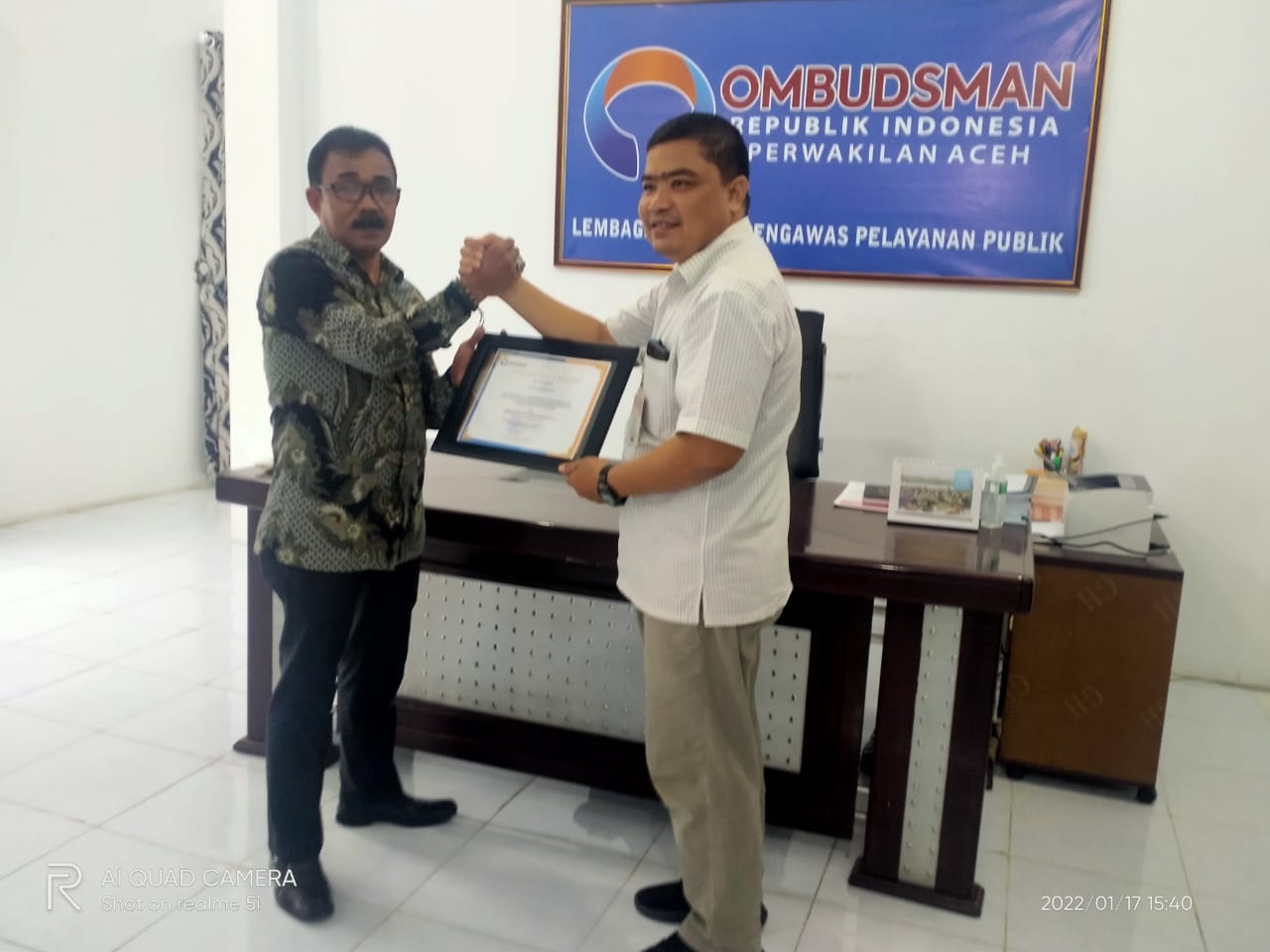 Piagam penghargaan tersebut diserahkan oleh kepala Ombusdman RI, Perwakilan Aceh, Dr Taqwaddin Husin,SH,SE,MS, diwakili Plt Kepala Ombudsman RI Perwakilan Aceh, Rudi Ismawan,SHi, MSi, didampingi sejumlah Stafnya, dan diterima langsung Pimpinan Perusahaan (PU) acehinspirasi.com, Teuku Pribadi, di Aula kantor Sekretariat Ombusdman, RI Perwakilan Aceh, Jalan Banda Aceh-Medan, Aceh Besar, Senin, (17/1/2022).