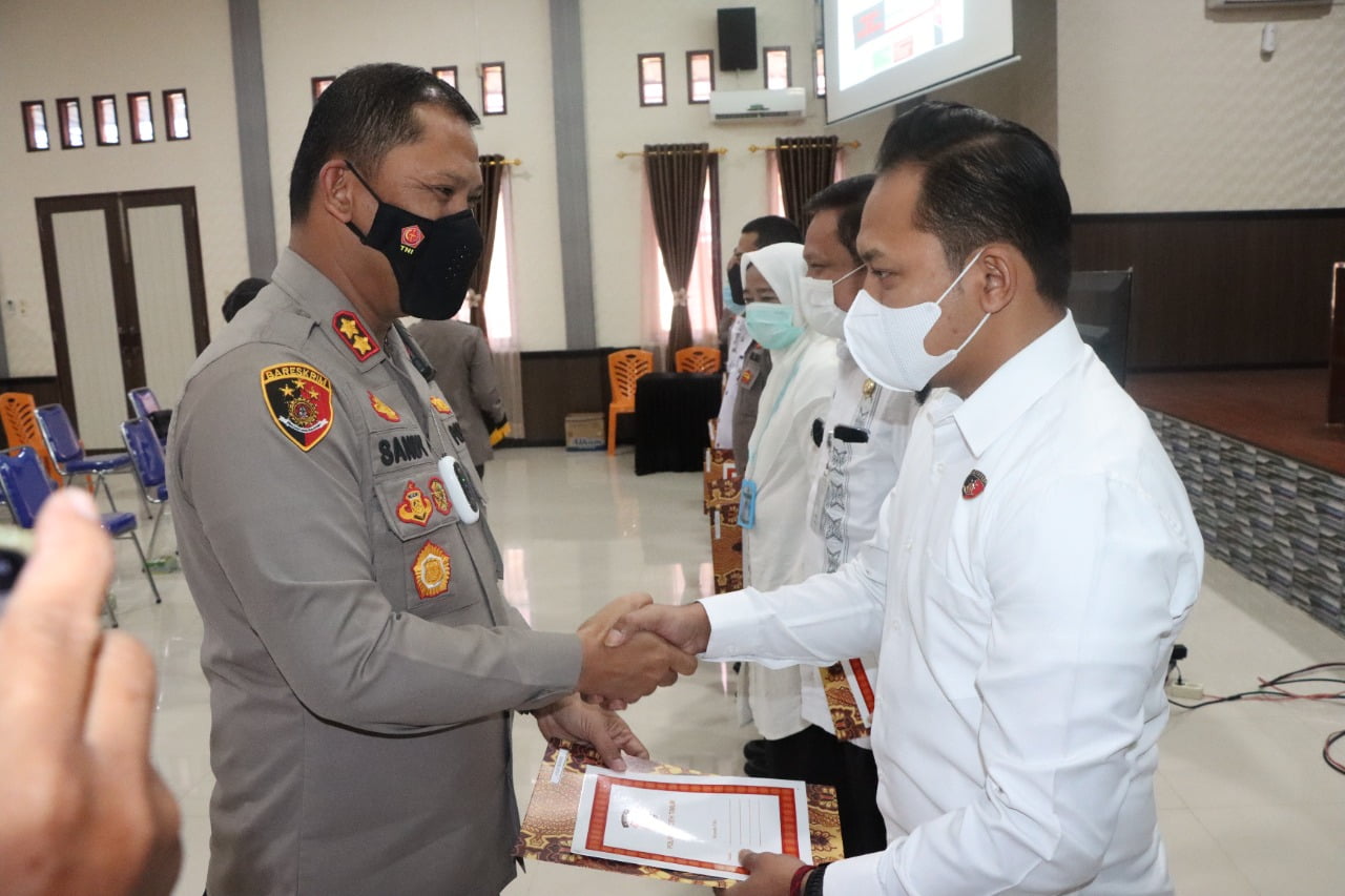 APJN.NET -Aceh Timur – Kapolres Aceh Timur AKBP Mahmun Hari Sandy Sinurat, S.I.K. menyerahkan penghargaan kepada Muspika dan kepala Puskemas serta Satfung Terbaik atas prestasi memobilisasi masyarakat pada giat perlombaan vaksinasi yang diselenggarakan dari tanggal 14 sampai dengan 20 Februari 2022.