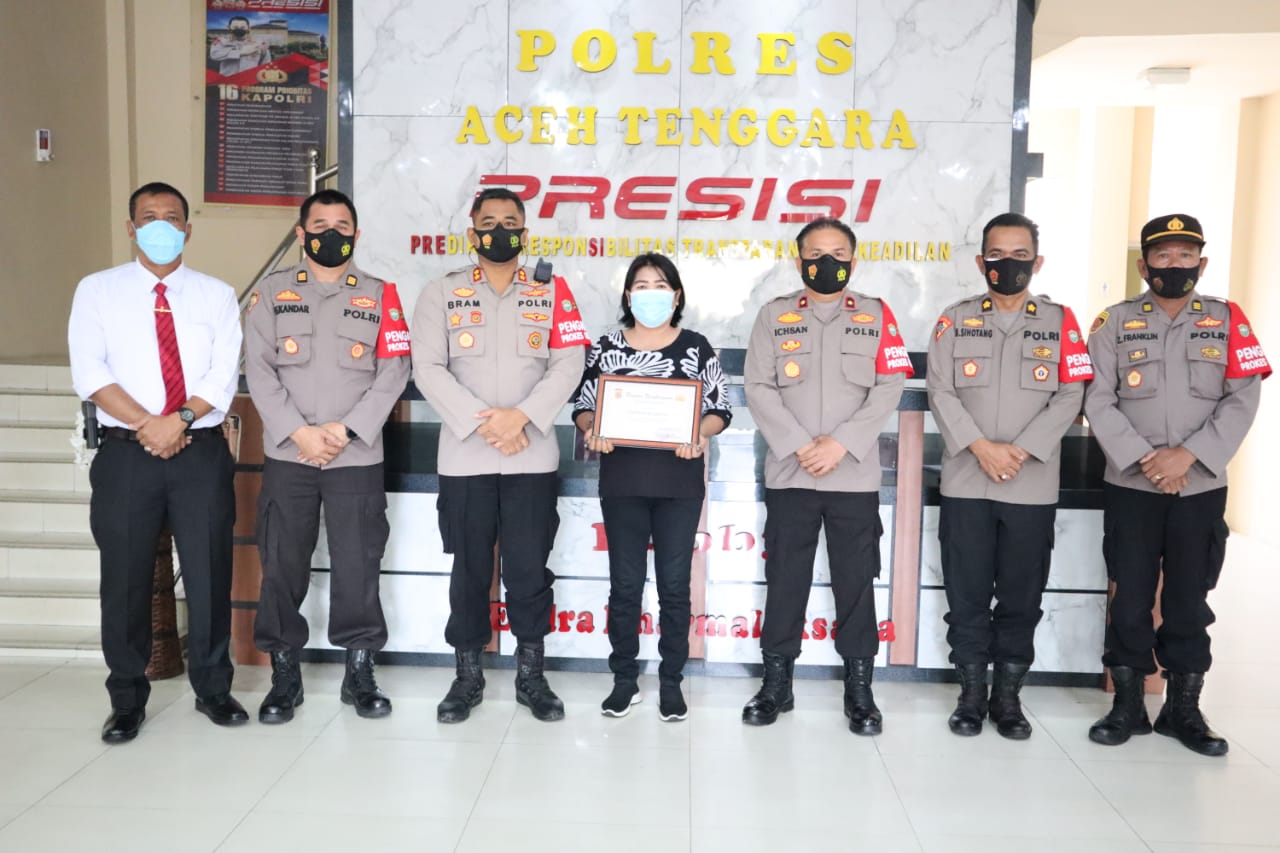 Menurut Kabid Humas, berdasarkan laporan Kapolres Aceh Tenggara, ibu Laosma BR Hutabarat yang merupakan warga Desa Lawe Petanduk menerima penghargaan itu di Mapolres Aceh Tenggara, yang langsung diserahkannya pada hari ini.